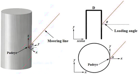 As shown in Figure 3, when the suction anchor moves horizontally under inclined loading without rotation, the inclined load can be simplified into a horizontal force H, a vertical force V, a constraining moment M, and mooring angle . By applying the principle of moment equilibrium, the optimal padeye depth Zpad,opt at the corresponding angle and the optimal centerline loading depth Zcl,opt can be obtained, which satisfy the equation: