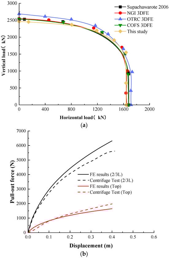 Furthermore, the accuracy of the constructed numerical simulation model was further validated by referencing centrifuge test data and finite element modeling results for non-cohesive soils from Kim et al. [28]. The loads were applied at the top of the suction anchor and below the mud surface at Zpad = 2/3 L, with cu = 7 kPa, the internal friction angle φ = 32°, and the dilation angle ψ = 8°. The selection of relevant parameters strictly followed those used in the centrifuge tests and the finite element model. The corresponding comparison results are shown in Figure 4b, which shows that the constructed numerical model can effectively characterize the bearing capacity of the suction anchor.