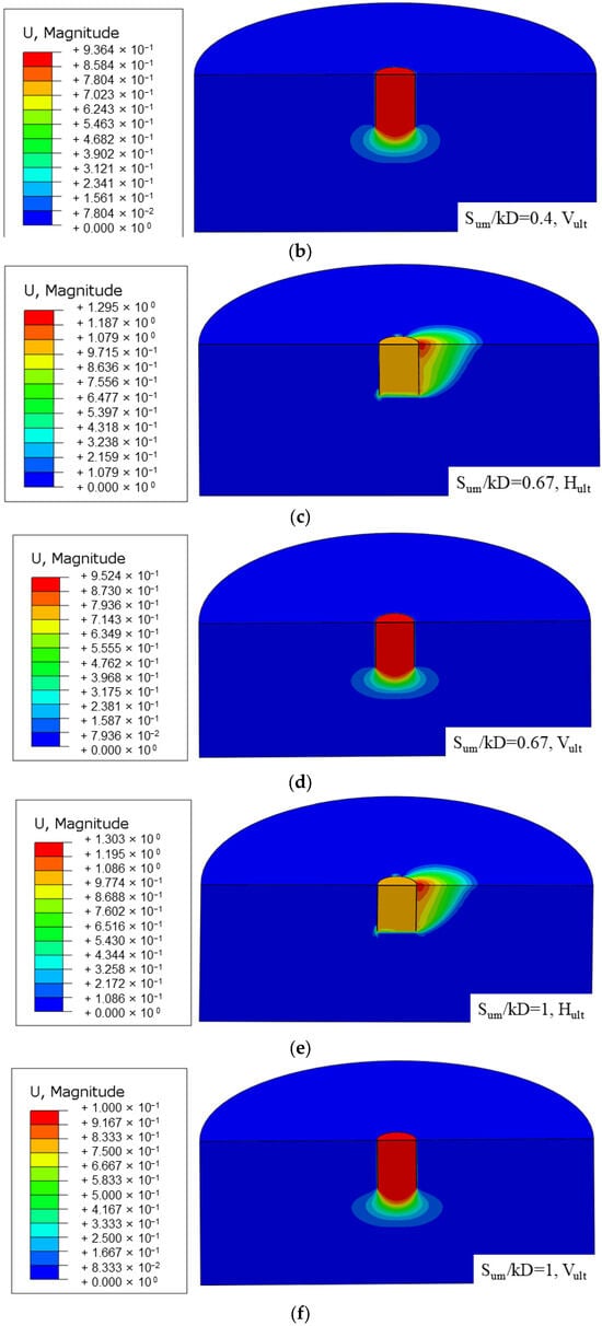 The displacement contour plots of suction anchors under horizontal/vertical loads (Sum/kD = 0.67,Tc/L = 0.5): (a,b) Th/L = 0.5; (c,d) Th/L = 0.75; (e,f) Th/L = 1.25; the units in the figures are meters.