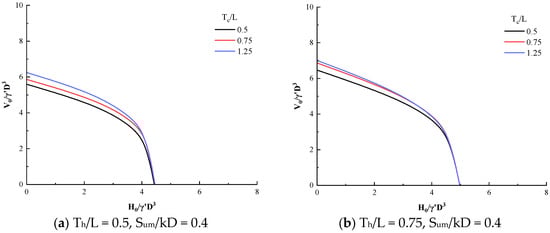 The thickness ratio Tc/L of the NC soil layer has little effect on the horizontal ultimate bearing capacity Hult but significantly affects the vertical ultimate bearing capacity Vult. For example, when Sum/kD = 1.0 and Th/L = 0.5, as Tc/L increases from 0.5 to 1.25, Hult changes little, rising only from 5017.5 kN to 5085.19 kN. Meanwhile, Vult increases from 5341.32 kN to 7211.5 kN, representing an increase of approximately 35.0%. Combining Figure 6 and Figure 7 with the studies by Supachawarote [50], vertical bearing capacity relies more on the accumulated effect of friction resistance at the anchor–soil interface (the accumulation of lateral friction and end resistance). As the strength of the clay in the suction anchorage zone increases, the friction resistance becomes more pronounced. In contrast, horizontal bearing capacity is dominated by the distribution pattern of lateral resistance. The influence of Tc/L on Hult is smaller than that of Th/L and Sum/kD, which leads to a relatively minor overall change in Hult.