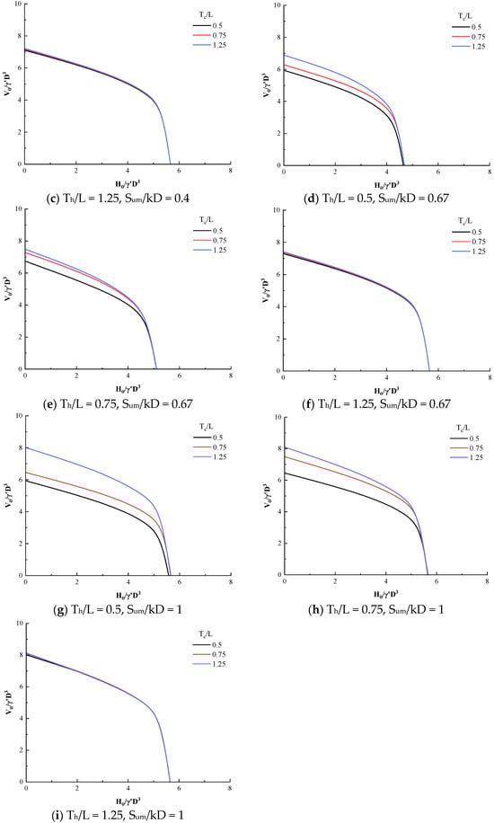 The results of VH failure envelopes: (a–c) Sum/kD = 0.4, Th/L = 0.5, 0.75, 1.25; (d–f) Sum/kD = 0.67, Th/L = 0.5, 0.75, 1.25; (g–i) Sum/kD = 1, Th/L = 0.5, 0.75, 1.25.