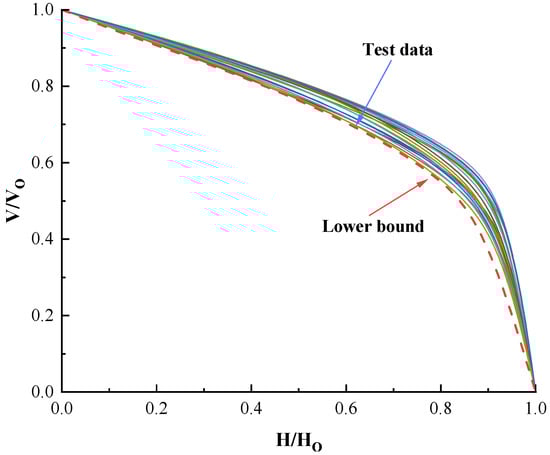 To visually represent the relative shape of the VH failure envelope, the results can be normalized based on the uniaxial bearing capacity H0 and V0. Extensive research indicates that the only lower bound solution of the VH failure envelope can be observed through relevant processing, which shows that the normalized VH failure envelope is independent of soil layer thickness and soil properties [53,54]. This conservative solution method allows the yield envelope in the VH envelope to be obtained simply by scaling H0 and V0. Based on previous research findings and regression analysis, the lower bound of the VH failure envelope, as shown in Figure 9, and can be expressed as follows: