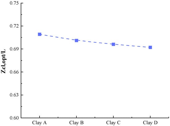 It can be seen from Figure 10 that for homogeneous clay with varying Sum/kD, as the clay strength increases, Zcl,opt decreases from 0.71 to 0.69. The increase in Sum/kD indicates a higher proportion of shear strength near the mud surface, shifting the center of gravity of the anchor shear strength upward. According to the principle of moment equilibrium, to prevent anchor rotation, Zcl,opt shifts slightly upward. Overall, Zcl,opt exhibited little change.