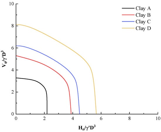 The VH failure envelopes for homogeneous clay are shown in Figure 12. By comparing with Section 4.3, it can be observed that the VH envelopes of layered clay exhibit distinct differences from those of homogeneous clay. Specifically, when the horizontal bearing capacity is high, the envelope retains relatively high vertical bearing capacity, with the LOC layer providing significant lateral friction resistance. Conversely, when the vertical bearing capacity is high, the envelope corresponds to a decrease in bearing capacity, where the anchor tip may be located in the NC or LNC layer, resulting in reduced end resistance.