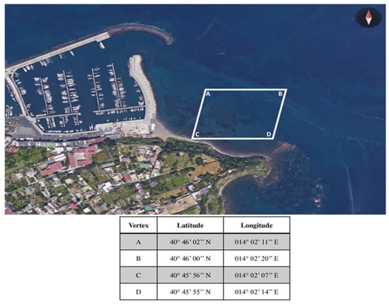 A map of the study area (highlighted by white square) and coordinates was constructed by Google Earth (https://www.google.it/intl/it/earth/index.html, accessed 12 November 2025).