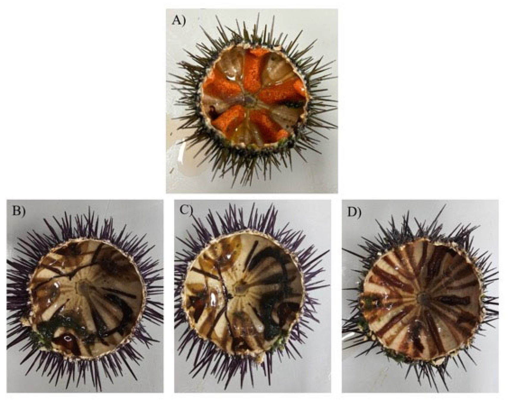 - Ruberti, N.; Brundu, G.; Ceccherelli, G.; Grech, D.; Guala, I.; Loi, B.; Farina, S. Intensive Sea Urchin Harvest Rescales Paracentrotus Lividus Population Structure and Threatens Self-Sustenance. PeerJ 2023, 11, e16220. [Google Scholar] [CrossRef]