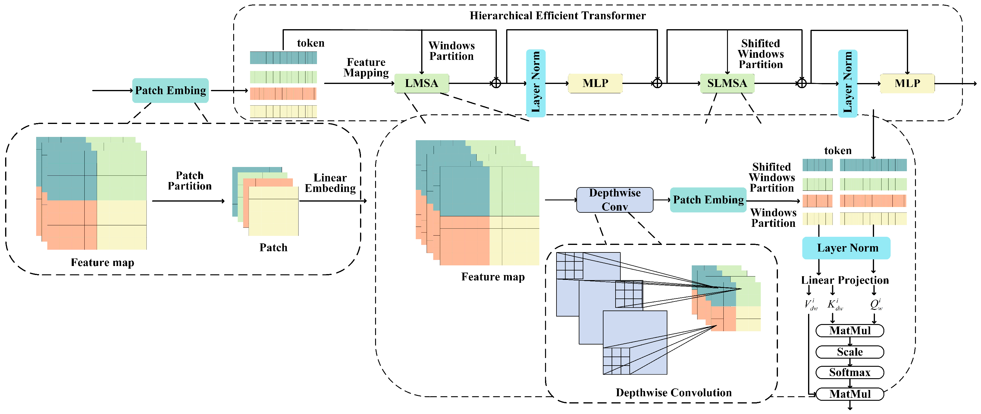 - A HETransformer is desired in TriEncoderNet, incorporating a lightweight multi-head self-attention (LMSA) mechanism. The LMSA mechanism facilitates cross-window interactions within local regions, captures global context, and effectively reduces computational complexity.