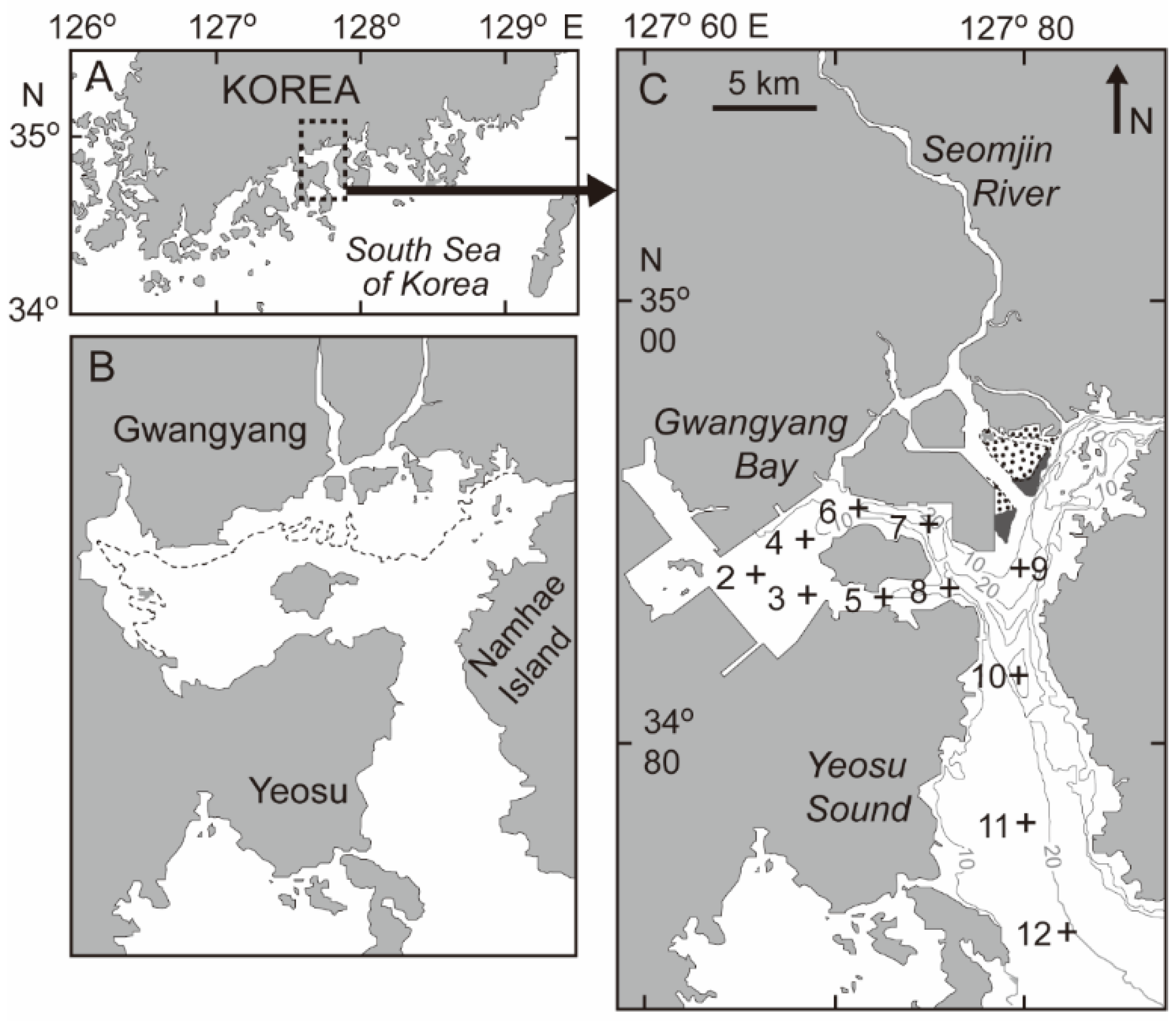 - Lee, Y.-S.; Kang, C.-K.; Choi, Y.-K.; Lee, S.-Y. Origin and spatial distribution of organic matter at Gwangyang Bay in the Fall. J. Korean Soc. Oceanogr. 2007, 12, 1–8. [Google Scholar]