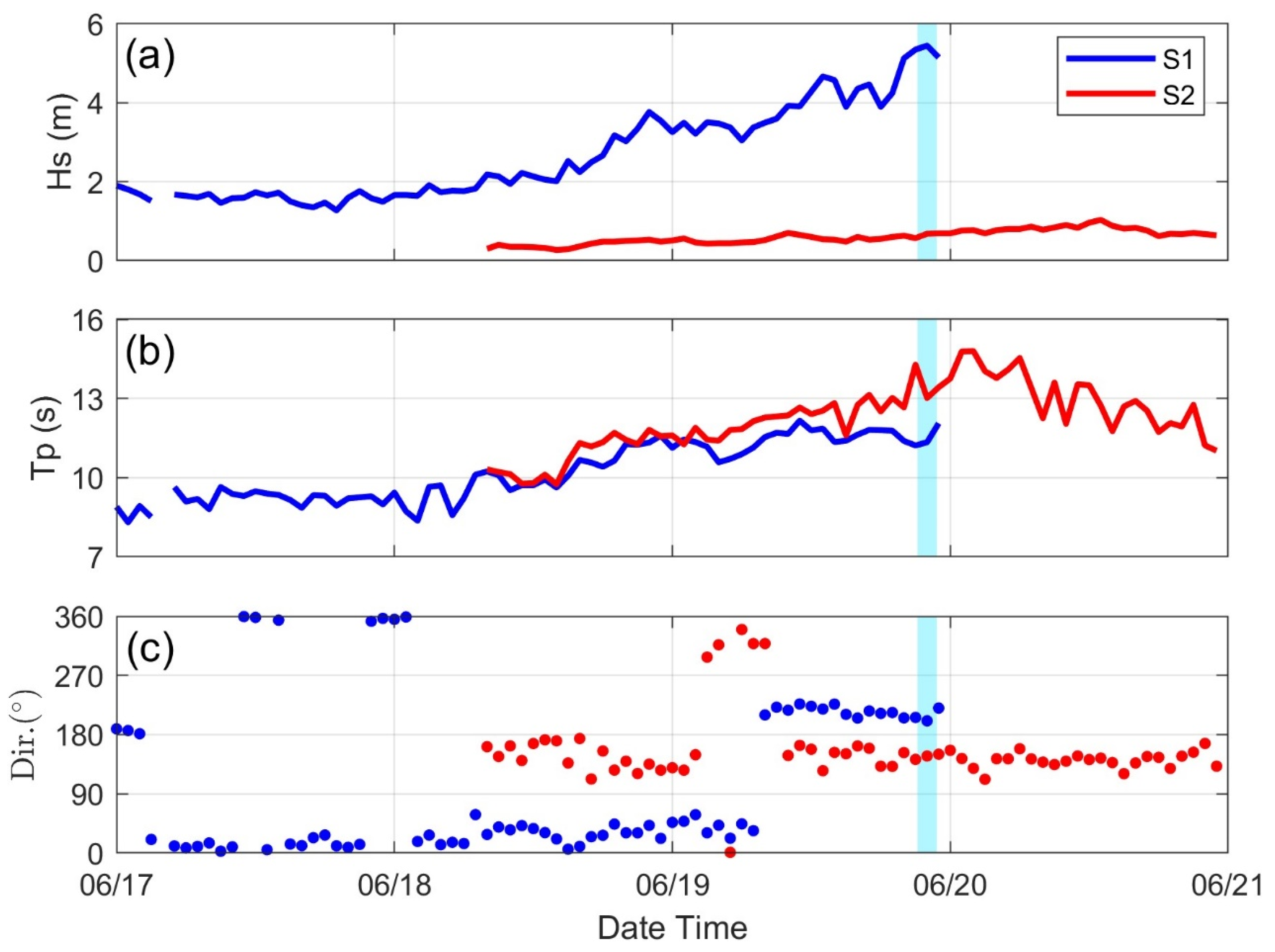 Station S2 began recording wave data at 08:00 on 18 June. S2 measured an HS of 0.68 m with a corresponding TP of 13.02 s when S1 registered its maximum wave height. Measurements at S2 continued until 21 June, during which HS gradually increased, reaching a maximum of 1.03 m with a TP of 12.73 s at 13:00 on 20 June, when data from S1 were unavailable.