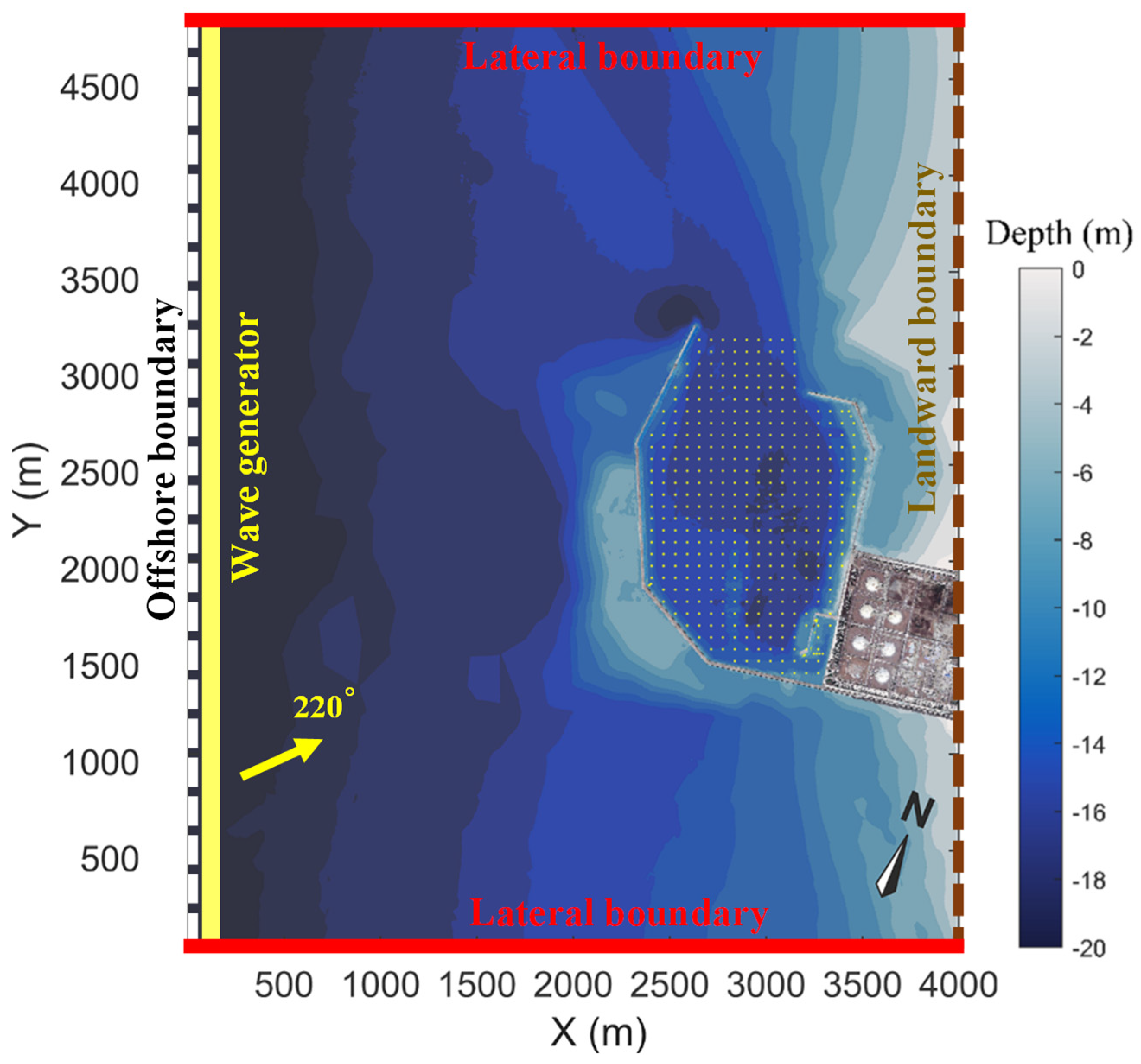 Figure 1b). The 2520 m long main breakwater is designed to protect the harbor from predominant southwest waves in the summer. Meanwhile, the 1030 m long secondary breakwater, which extends along the eastern and northern lateral boundaries, shelters the harbor from minor northwest waves in the winter. The 650 m wide harbor entrance is oriented toward the north and directly exposed to the open sea. Additionally, a tugboat dock is located in the corner of the inner basin, enclosing a 320 m long and 90 m wide berthing basin.