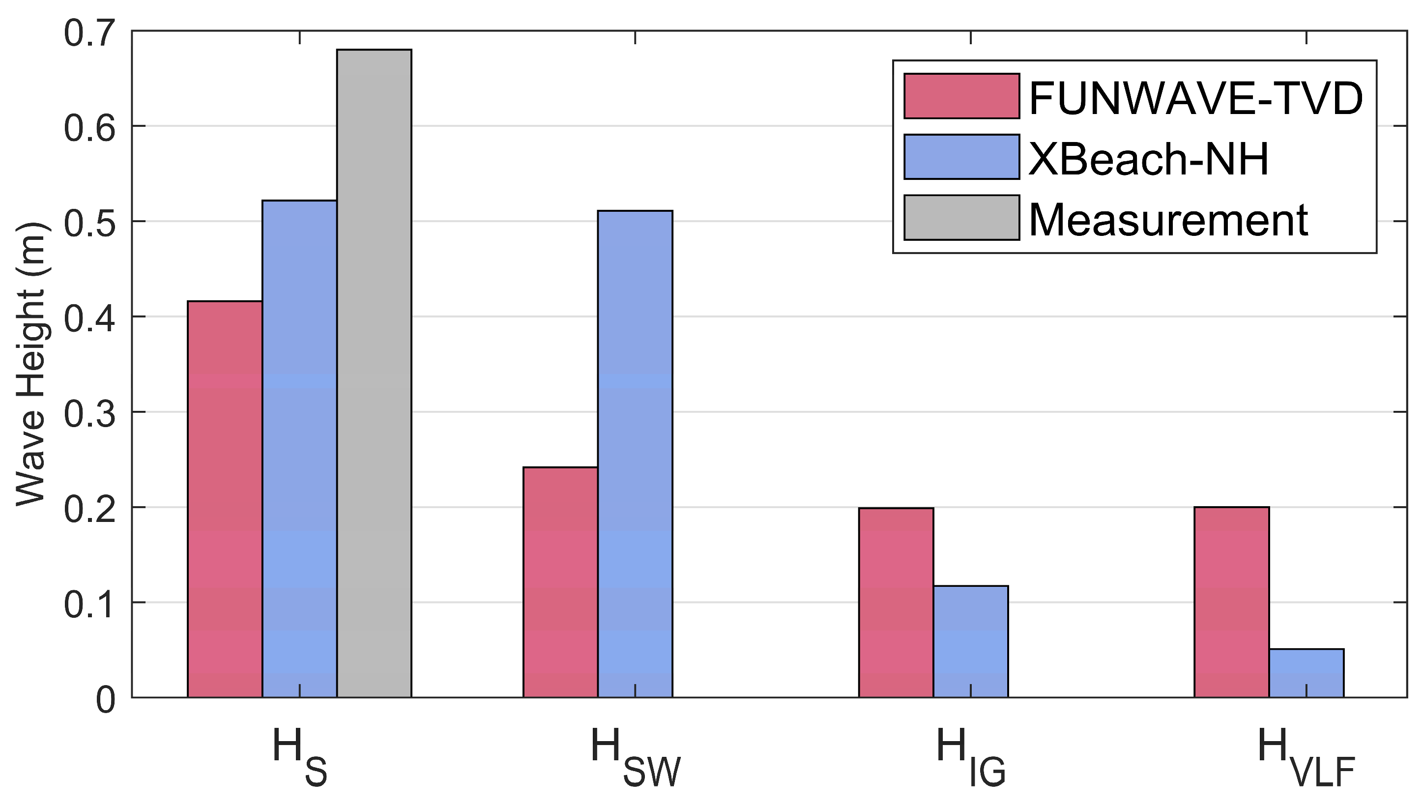 S relative to the measured value of 0.68 m. XBeach-NH showed closer agreement, with a 25% error, compared to 38% for FUNWAVE-TVD. This underestimation of H