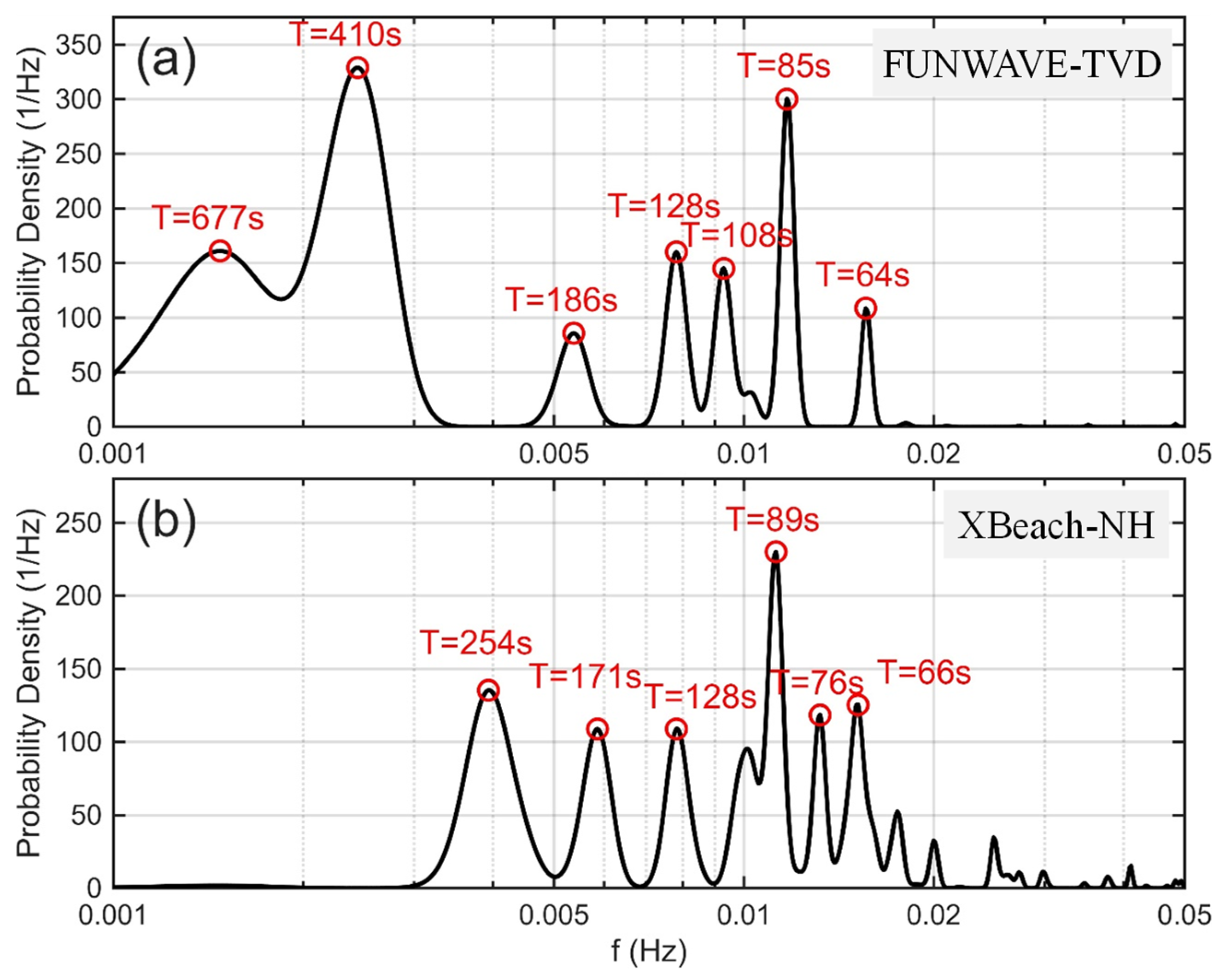 Figure 7b) showed dominant modes at 254 s, 171 s, 128 s, 89 s, 76 s, and 66 s within the IG band, with the strongest concentration at 89 s. Despite these differences, both models consistently reproduced a robust mode at 128 s and identified resonance modes in comparable frequency ranges. Specifically, FUNWAVE-TVD peaks at 85 s and 64 s correspond closely to XBeach-NH peaks at 89 s and 66 s. Residual discrepancies can be attributed to differences in numerical formulations and their sensitivity to specific long-wave processes.