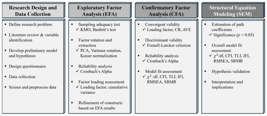 In the third step, confirmatory factor analysis (CFA) was performed by integrating the construct concepts derived from the EFA with the existing TAM factors. The appropriateness of the construct concepts was verified through content validity, discriminant validity, and internal consistency. This process enabled use of the construct concepts in structural equation modeling.