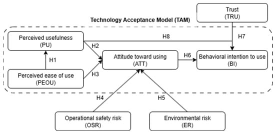 Additionally, referring to prior research, we expanded the concept of trust (TRU) to reflect concerns about the safety of alternative fuels [42,78,79,86,87,88]. Although various studies have indicated that trust influences the four components of the existing TAM (PU, PEOU, ATT, and BI), we established H7 based on the expectation that the actual BI will change directly based on the trust felt by individual users. We established H8 based on the expectation that PU, independent of mediating ATT, would directly influence BI if the actual utility of transitioning to alternative fuel was judged to be high, regardless of attitude.