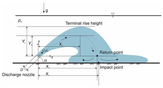 The brine jet, with density ρ j e t , is released from the round nozzle of diameter D at velocity U 0 and an inclination angle α . Driven by its initial momentum, the jet ascends along the discharge angle, reaches a maximum height, and then descends towards the seabed [5]. The point at which the jet first touches the seabed is referred to as the impact point. During this process, entrainment and re-entrainment occur continuously [6], leading to the progressive dilution of the brine.