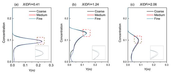 Additionally, comparisons were made by plotting concentrations at various vertical sections (X/DFr = 0.41, 1.24, and 2.06) within the flow region using different mesh configurations.