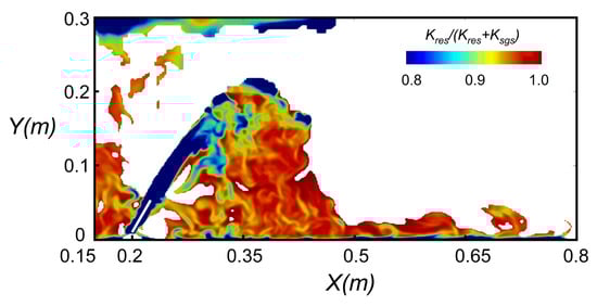 Figure 4. Instantaneous turbulent kinetic energy ratio K r e s K r e s + K s g s at the center plane (t = 90 s).
