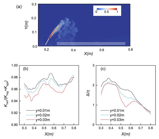 Figure 5. (a) Instantaneous concentration field of the inclined jet on the 0° sloped bottom, with three horizontal lines at y = 0.01 m, 0.02 m, and 0.03 m; (b) ratio of resolved to total turbulent kinetic energy K r e s K r e s + K s g s along these lines; (c) ratio of LES filter width to Kolmogorov length scale ( Δ / η ) along the same sections.