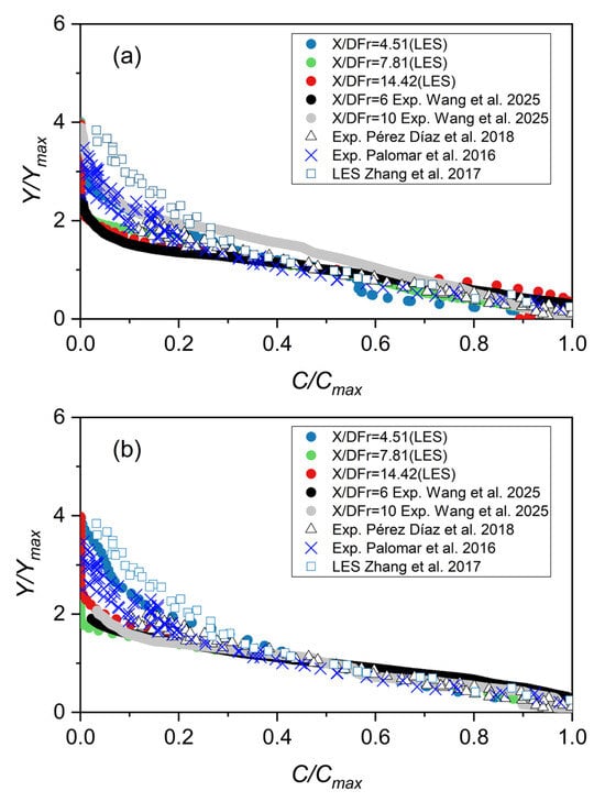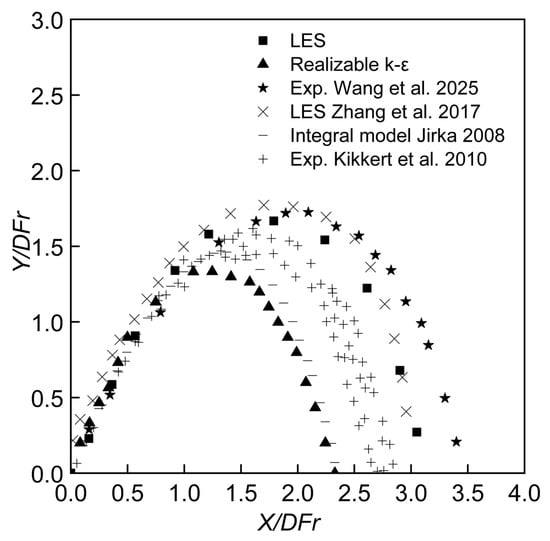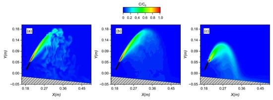 Figure 6c presents the concentration field simulated using the realizable k–ε model. Compared to the LES results, the jet appears smaller, more confined, has a lower maximum rise height, and reaches the impact point at a shorter distance. This difference is likely due to the realizable k–ε model underestimating the initial momentum and turbulent kinetic energy and consequently leading to a higher predicted concentration compared to the LES results. Similar observations were reported by Wang and Mohammadian [26], who found that RANS models generally underperformed when simulating inclined jets at higher discharge angles (60°). Zhang et al. [28] also emphasized that LES has a better performance in complex turbulent jet simulations.