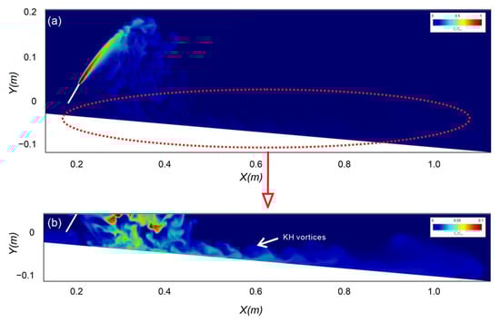 In the instantaneous LES field (Figure 6a), complex turbulent structures and flow driven jointly by momentum and negative buoyancy can be clearly observed. After exiting the nozzle, the jet rises due to its initial momentum, reaches a maximum height, and then descends as negative buoyancy becomes dominant. During the descending stage, detrainment occurs along the inner side where part of flow peels off from the main jet. This behavior destroys the symmetrical shape of the jet and is commonly referred to as gravitational instability. As the jet continues to discharge, entrainment and re-entrainment along the inner region make the inner boundary blurred. The simulated flow pattern agrees well with the experimental observations [6,15,36]. These instantaneous turbulent features and local instabilities are smoothed out in the time-averaged field (Figure 6b), causing the descending region to appear less distinct than the ascending region. When the discharge angle is relatively large, the descending flow also tends to become more vertical and plume-like [52].