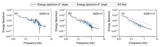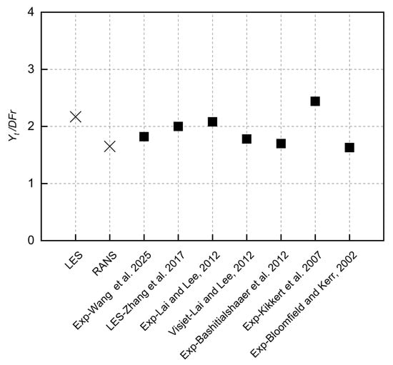 Figure 5b,c show the distributions of the ratio of TKE and Δ/η along the three lines, respectively. The Kolmogorov length scale was estimated as η = ( ν 3 / ε ) 0.25 , where ε is the turbulent dissipation rate computed from the mean field. A commonly used criterion is Δ/η ≤ 12, which is derived from Pope’s [50] estimation and has been adopted in other LES studies [34,51]. In the present study, Δ/η remains below 3 (well below the threshold value of 12) near the impact region, indicating that the mesh resolution is adequate.