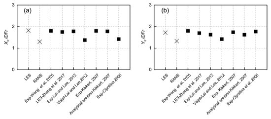 The left wall, bottom wall, front wall, and back wall were assigned no-slip boundary conditions. A symmetry condition was applied at the top boundary. The right wall (outlet) boundary was set to zero-gradient condition. Both the RANS and LES models were implemented in the open-source software OpenFOAM v5.0. In this study, the solver twoLiquidiMixingFoam was specifically applied to simulate the mixing of two incompressible fluids. The solver has been extensively validated in various CFD studies, and its reliability and accuracy have been demonstrated [27,46,47]. All simulations were performed with a timestep of t = 0.005   s . The total simulation time was 120 s, which was sufficient for the jet to reach a quasi-steady state and for the flow characteristics along the bottom after impingement to be fully captured.
