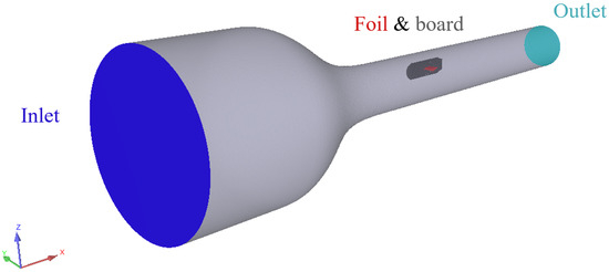 Cavitation tunnel geometry with the foil and board, and inlet and outlet patches.