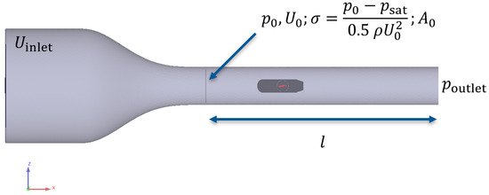 Typically, in a CFD analysis, the designated velocity is assigned by the inflow boundary condition, and the outflow boundary condition sets the desired pressure level. In this case, the cavitation tunnel forms a Venturi tube, where the test section is located in the region of increased velocity. The speed in the test section, , is determined based on mass conservation, that is,