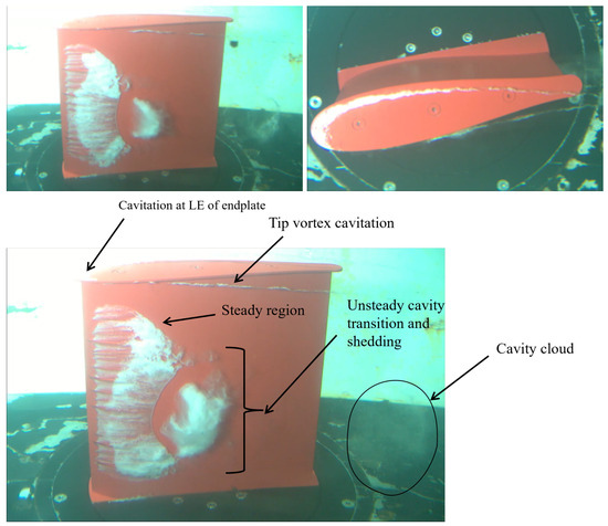 The mean global forces and visualization of cavity appearance are available from experiments under different flow conditions. Figure 6 shows an experimental observation of the cavitation appearance of the foil at . The sheet cavitation formed near the leading edge covers roughly a third of the chord, with its tail part then periodically transforming into cloudy, bubbly structures. Cavity shedding was observed, occurring roughly from slightly above the root to past the mid-span of the foil, as seen in the figure. The cloud cavities were convected to the wake and past the trailing edge of the foil. The steady region shown in the figure indicates the absence of cavity shedding behavior based on experimental observation, but its extent and closure shape fluctuated slightly. In addition, tip vortex cavitation occurs on both sides of the end plate.