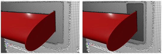 Views of the fine and extra-fine CFD grids near the foil and the tip. On the left: fine grid. On the right: extra-fine grid.