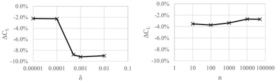 Errors in CFD predicted lift coefficients with the SST-D (left) and SST-R (right) using different model parameters on a coarse grid. For reference, the SST method (without damping) gave an error of .