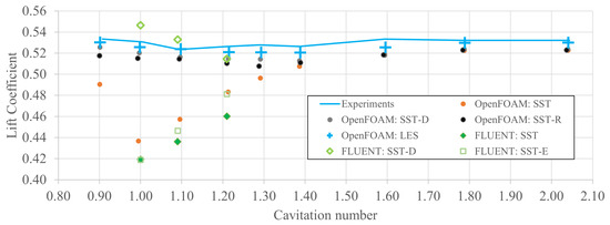 SST-D is similar to the LES result in terms of mean gas volume, compared to the SST-R model in Figure 14. When cavitation formation is not substantial enough, the use of additional damping with the SST method does not notably influence mean foil performance. This is evident for cases with approximately . Even the fine-grid LES was insufficient to predict the tip vortex cavitation accurately; the grid resolution near the tip was too coarse to capture the low-pressure peak in the fine vortex core. In the finest grid simulations, the cavitation of the tip vortex is visible (Figure 9). It is also interesting to note that, using the LES method, the results of global forces and their dynamics based on time history analyses were very similar for all grids. Even the coarse-grid LES produced a tiny deviation from the experimental result and the solution of the finest grid LES. Although the grid spacing affects the resolution of turbulent spectra, the current meshes appear to be appropriate for the WALE approach. Future work on this topic will be necessary.