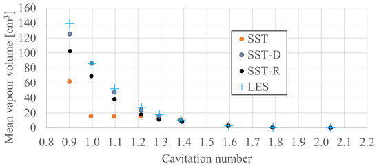 Based on experimental observations and video recordings, we assessed the stability of the cavity, focusing on the shedding of the sheet cavity into the slipstream of the hydrofoil. Snapshots of some conditions are shown in Figure 18. The experiments showed that the attached sheet cavitation on the hydrofoil was stable for approximately . Notable cavitation shedding began to occur when this value was approximately four or less, with an increasing amount of vapor being shed as this value decreased, as seen in Figure 18. These observations are consistent with those discussed by Leroux et al. [52], who experimentally studied a NACA hydrofoil under cavitating conditions and showed that a limit for which the stable cavity transitions to an unstable cavity is , which they accredit as Arndt et al. [53] criteria (cf. Figure 19). In fact, a potential flow solution for steady cavitating hydrofoils [54] gives unsteady partial cavities for approximately . In addition to the experimental results presented here, the simulations with all the turbulence modelling approaches considered show a similar behavior, which is visible, for example, as a clearly increased RMS fluctuation in Figure 19 of the total volume of the vapor for approximately or . In addition, throughout the investigated range of cavitation numbers, the RMS fluctuation of the gas volume is at a level similar to that of the SST-D and LES solutions. The SST method clearly does not produce fluctuations even as the cavitation number decreases and only shows an increased RMS level at the lowest investigated cavitation condition, . This could also explain the anomaly of the higher mean lift force obtained with the SST in Figure 13 at the lowest .