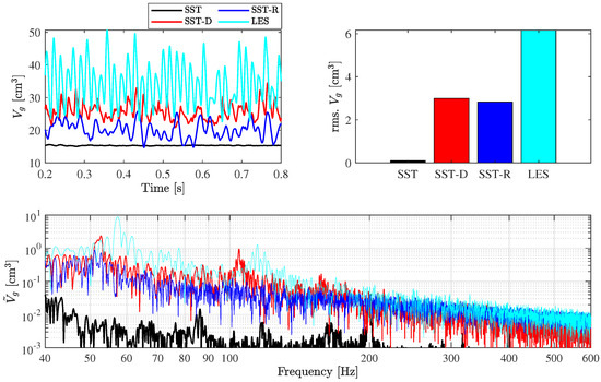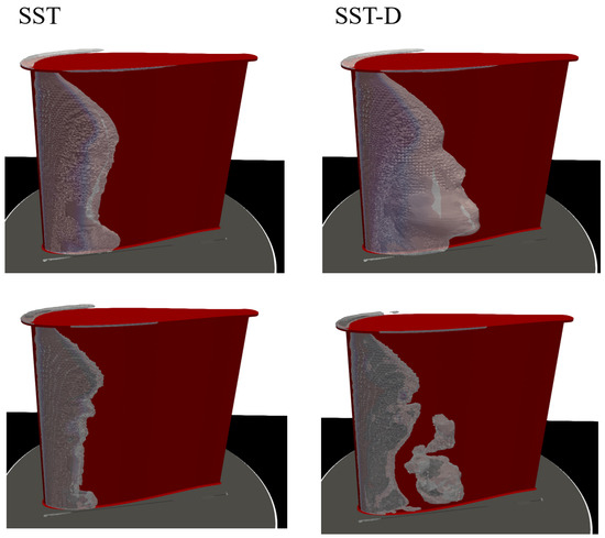 Figure 16 shows the results in the time and frequency domains, as well as the RMS fluctuation of vapor volume presented as bars using the different turbulence modelling methods. Figure 17 compares the mean and instantaneous cavitation appearances of the SST and SST-D methods, showing a slight variation with SST and notably larger unsteady behavior with SST-D. The SST result in the time domain is nearly a flat black curve in Figure 16, indicating that there is not much change in the vapor volume as a function of time. There is no frequency domain content and no unsteady cavitation shedding, whereas results from the other methods (SST-D, SST-R, and LES) show an apparent variation with time. In fact, the SST-D result is somewhat similar to the LES solution in the sense that the mean amount of vapor is also elevated compared to the SST solution, and the time and frequency domain results have a similar shape. However, the amplitude of fluctuation is lower with the SST-D method than with the LES method. Higher-order harmonics in gas volume fluctuation are visible in both the SST-D and LES solutions of similar amplitude. The magnitudes of the amplitudes and dominant frequencies differ slightly, with Hz and 57 Hz for SST-D and LES, respectively. These correspond to Strouhal numbers of ≈ 0.56–0.59. LES results and SST-D results on finer grids have shown periodic shedding with . This was also predicted using the SST-D method on the finer grids. Although detailed experimental results on time-resolved cavitation dynamics are not available, experimental observations and video recordings indicate clear cavity cloud shedding under this condition ().