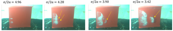 Observation of cavitation extent at different values of . Snapshots from experimental video recordings, with arrows indicating a detaching cavity cloud from the main sheet.