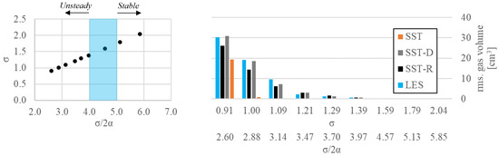 Classification of stable and unsteady cavitation (left) with markers showing simulated conditions, and RMS. fluctuation of gas volume (right) with different turbulence modelling methods. The secondary x axis on the right graph shows corresponding values of the parameter .