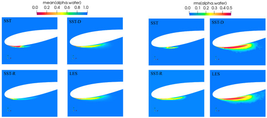 Figure 20 shows the mean volume fraction near the foil on a cut plane at mid-span over a time span of 0.5 s, covering roughly 30 cavity shedding cycles for the different turbulence modelling methods. The figure also illustrates the corresponding rms. fluctuations of the volume fraction fields over this time period, comparing the variability in the volume fraction using the different turbulence models. We note, however, that cavitation on the foil was highly three-dimensional and varied significantly with chordwise and spanwise locations. However, comparisons at the cross-section provide helpful insights into the performance and behavior of the different models. Table 7 shows the cavity lengths determined from these results. Note that these lengths, especially the values from the tests, contain some uncertainty, as they are visually determined and measured based on video recordings or from the averaged CFD simulation results. In the figure, the mean cavitation extents are very similar between the SST-D and LES methods. In addition, their shapes and local vapor contents are similar between these methods. The SST model yields a considerably shorter mean extent, accompanied by a significantly larger vapor concentration near the foil surface, extending up to the cavity closure. Compared to experiments, SST under-predicts cavity length and shows minimal fluctuation. The SST-R predicts a thinner mean cavity shape with a lower vapor concentration compared to the SST-D and LES methods. The cavity fluctuation is also very similar between the SST-D and LES methods. Their shapes and vapor concentrations are nearly identical, with LES showing a slightly more elongated extent of the cavity oscillations in dilute regions with very low vapor content. The SST-R produces significantly less variability in the cavity, with different vapor concentration profiles as well. With the SST method, some oscillation occurred only near the closure of the sheet cavity, without any shedding of vapor structures to the wake. Based on the cavity-length results, the SST-D and LES are, again, closest to the experimental result. In addition, the methods give similar magnitudes for the fluctuating extent, as is also visible in Figure 20.