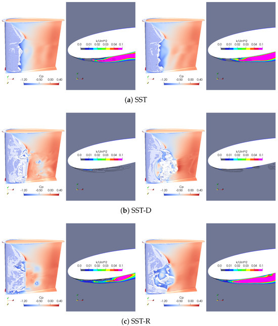 Figure 21 shows the pressure coefficient () and non-dimensional turbulent kinetic energy () predicted using different models. The figure displays two instantaneous snapshots at different stages of cavity shedding, obtained from simulations for each turbulence model. The SST-D method significantly reduces the modeled turbulent kinetic energy compared to the SST and SST-R methods. The SST method generates a large amount of turbulent kinetic energy, with an increasing trend toward the cavity closure and downstream from it. The SST method yields large k levels well before cavity closure, whereas the SST-R exhibits a similar increase, albeit more pronounced at cavity closure. The SST-D method, then again, shows minimal production of k within the two-phase region. Cavitation shedding and oscillation are also visible in fluctuations in the pressure coefficient values on the foil surface. All models predict low levels of k within the cavity, that is, in areas with a higher vapor content.