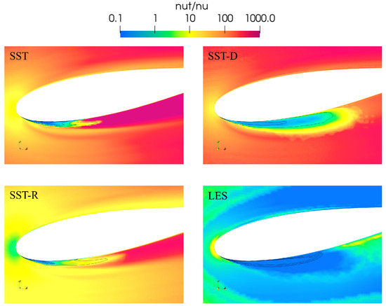 Figure 22 shows the mean ratios near the foil on a cut plane at mid-span over a time span of 0.5 s, covering roughly 30 cavity shedding cycles for the different turbulence modelling methods. Lower values of near the cavity interface indicate better resolution of the unsteady cavitation dynamics; excessive eddy viscosity can suppress important flow instabilities. Turbulence damping methods (SST-D and SST-R) and LES provide lower eddy viscosity levels compared to those of the standard SST-RANS model. The SST-R method reduces levels compared to SST, and the SST-D method produces considerably lower magnitudes. In particular, the predicted eddy viscosity level in the wake of the cavity is similar between the SST and SST-R methods but significantly lower for the SST-D method.