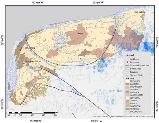 The geology of the study area is predominantly composed of limestone formations ranging from the Eocene (55 Ma) to the Holocene (0.01 Ma). The city of Mérida lies within the Carrillo Puerto Formation of the Pliocene (5.1–1.68 Ma), which contains fossil evidence [51]. Coastal mangrove zones are classified as confined areas due to their low permeability and the presence of surface-weathered limestone, commonly referred to as “caliche” [43]. Semi-confined zones are defined as groundwater transit areas characterized by silty limestone.