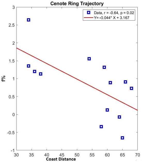 Figure 6 shows that sites within 20 km exhibit fsea% >1, indicating significant seawater influence. Negative values represent freshwater sites, whereas positive values indicate salinity. The proposed equation is based on a linear approximation (r = −0.64, p = 0.02), suggesting a correlation between these variables in the context of groundwater flow from inland toward the sea [28,29]. Selected sites are shown in Figure 5 along the Cenote Ring trajectory.