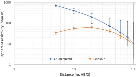 Apparent resistivity graph of VES in Celestun and Chunchucmil applying the Schlumberger array.