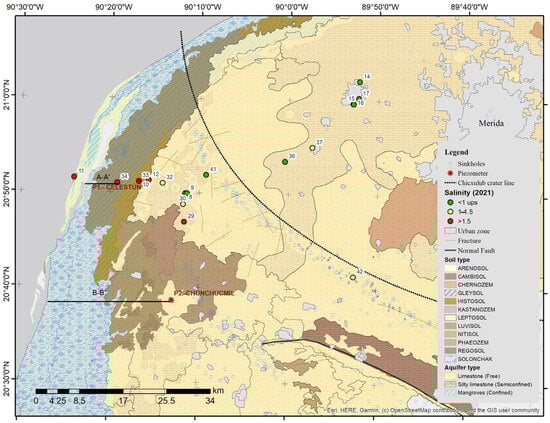 - Narvaez-Montoya, C.; Bonilla, R.M.; Goldscheider, N.; Mahlknecht, J. Groundwater salinization patterns in the Yucatan Peninsula reveal contamination and vulnerability of the karst aquifer. Commun. Earth Environ. 2025, 6, 468. [Google Scholar] [CrossRef]