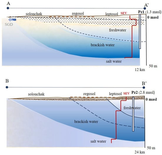 Hydrogeological section A–A’ (upper) and B–B’ (lower) oriented W-E according to geophysical and CTD interpretations. It shows the subsoil geometry and the salinity gradient (the red line indicates the geoelectric model). The water table is represented. Note. Pz: piezometer; SEV: Vertical Electrical Sounding; SGD: submarine groundwater discharge; masl: meters above sea level.