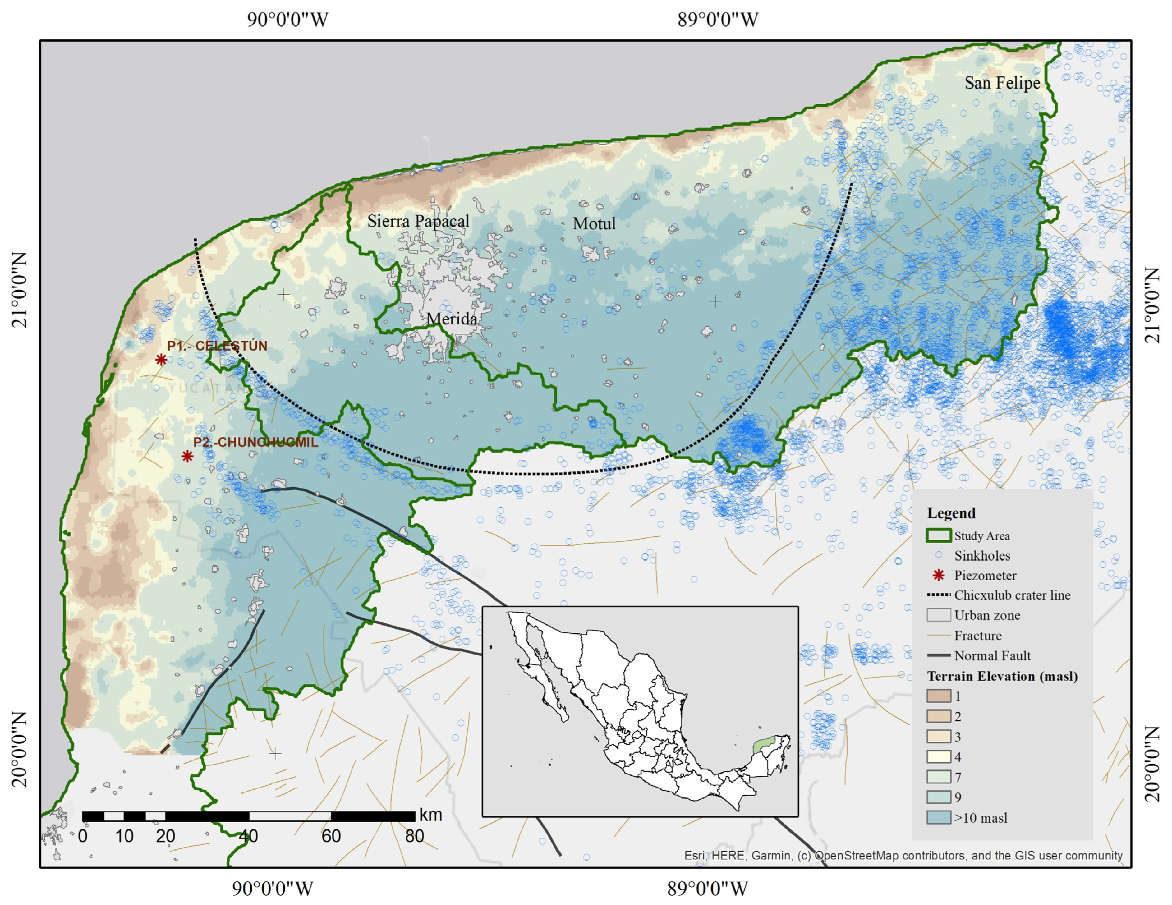 - Villasuso-Pino, M.J.; Sánchez y Pinto, I.A.; Canul-Macario, C.; Casares-Salazar, R.; Baldazo-Escobedo, G.; Souza-Cetina, J.; Poot Euán, P.; Pech Argüelles, C. Hydrogeology and conceptual model of the karstic coastal aquifer in Northern Yucatan State, Mexico. Trop. Subtrop. Agroecosystems 2011, 13, 243–260. [Google Scholar]