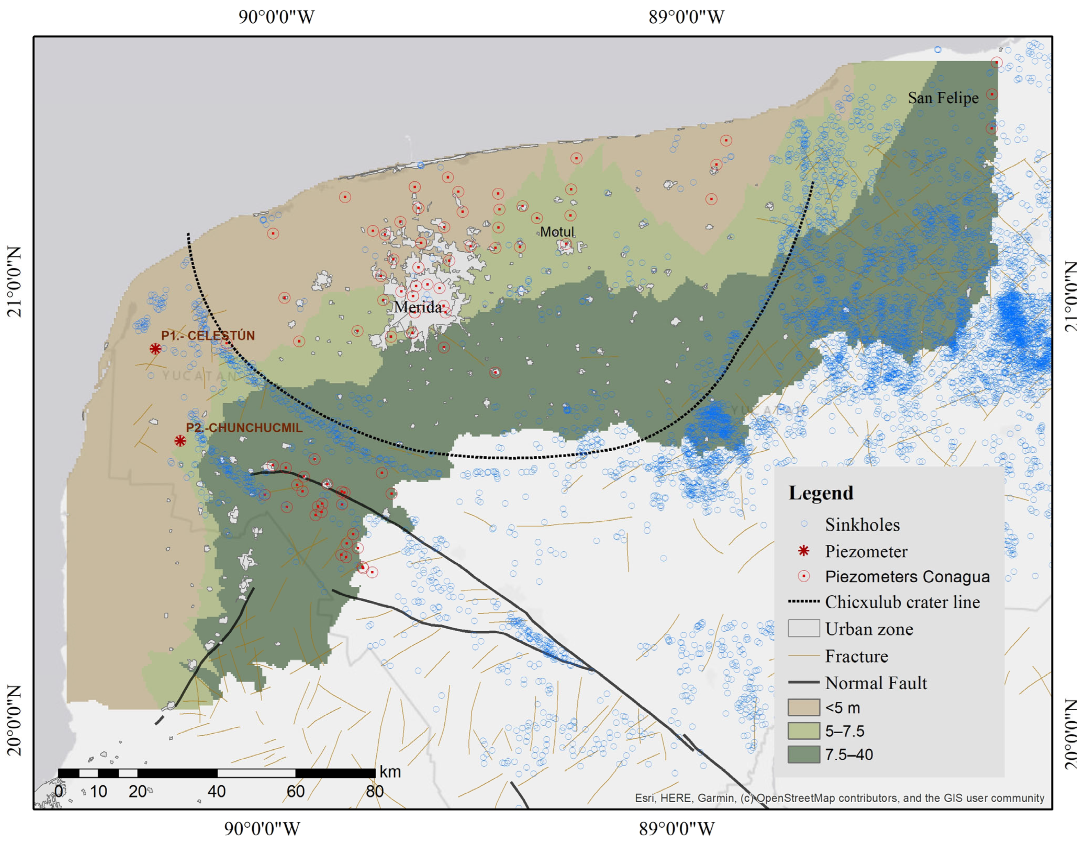 - In the Opichén network, the average water table depth is 28.5 m, with a minimum of 8.6 m and a maximum of 51.1 m.