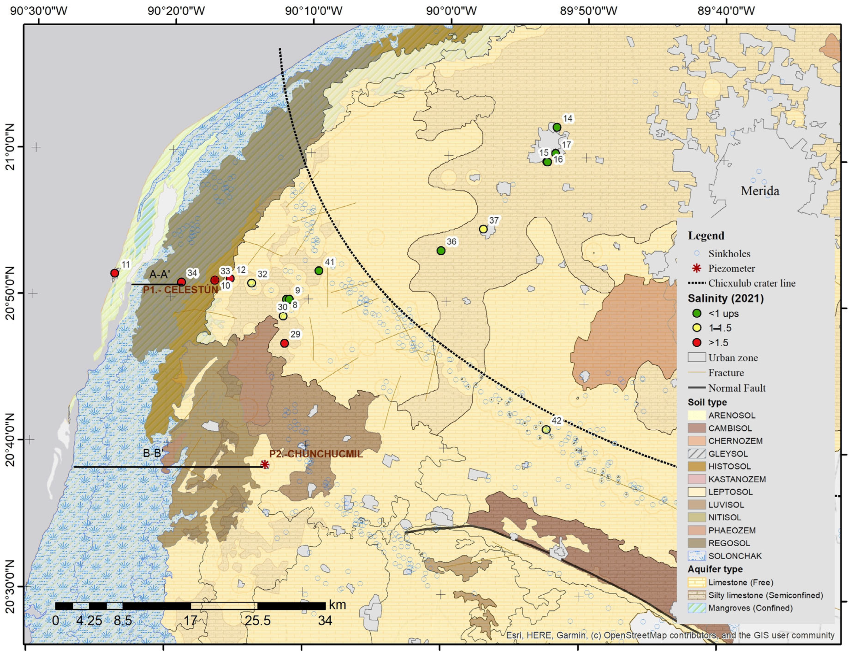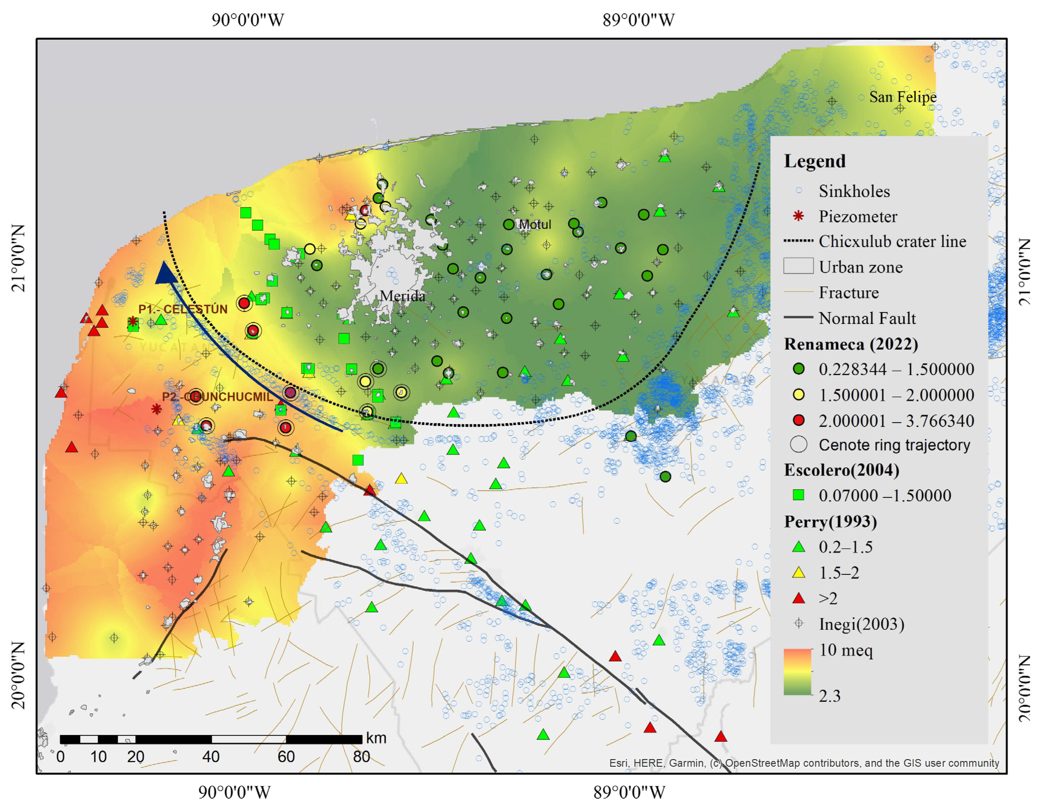 - Narvaez-Montoya, C.; Bonilla, R.M.; Goldscheider, N.; Mahlknecht, J. Groundwater salinization patterns in the Yucatan Peninsula reveal contamination and vulnerability of the karst aquifer. Commun. Earth Environ. 2025, 6, 468. [Google Scholar] [CrossRef]