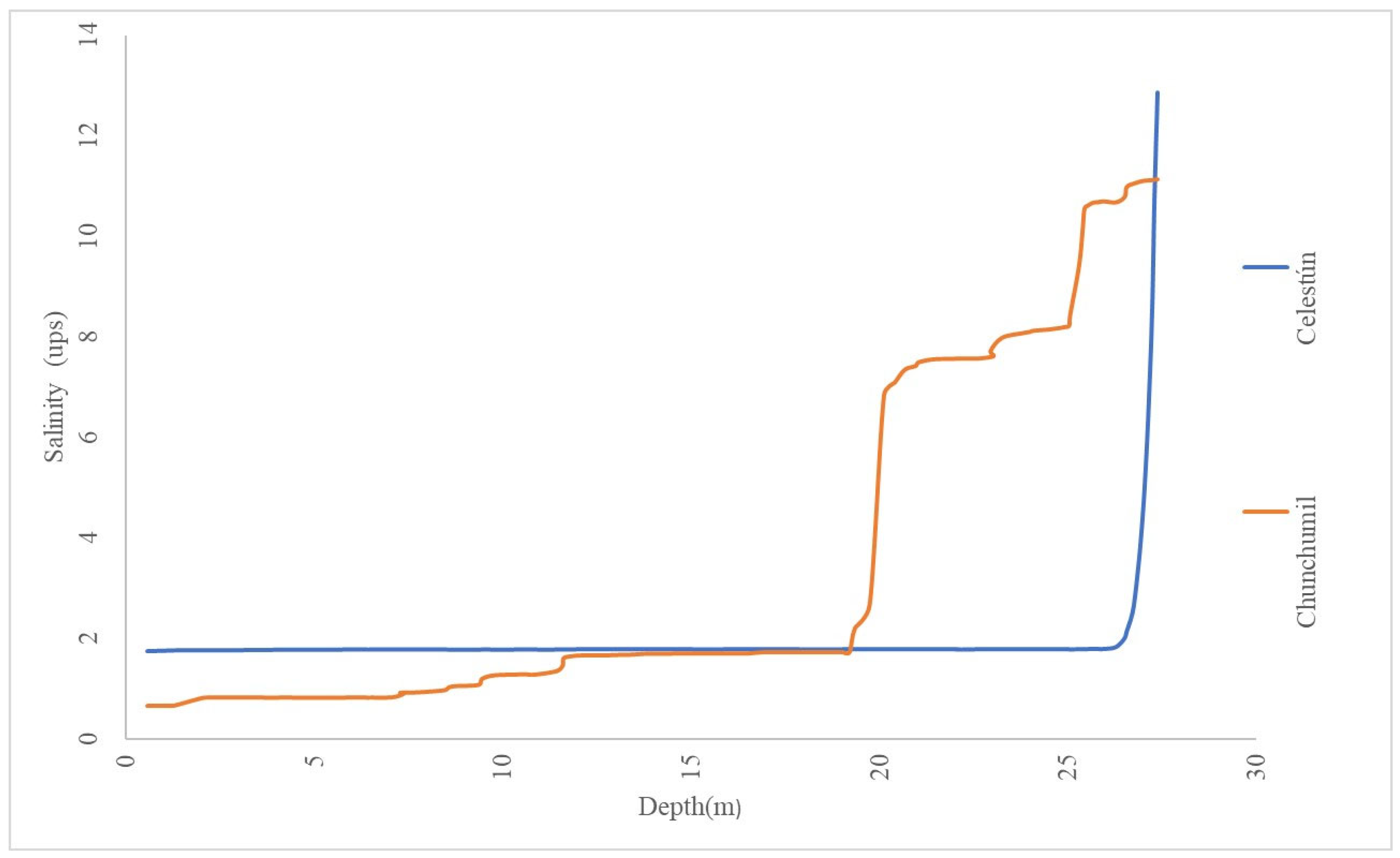 - Monitoring of the freshwater–saltwater interface was performed by measuring conductivity, temperature, and depth using a CTD Diver (VanEssen), with readings ranging from 0 to 120 mS/cm in two piezometers located in Celestun and Chunchumil (see Figure 1).
