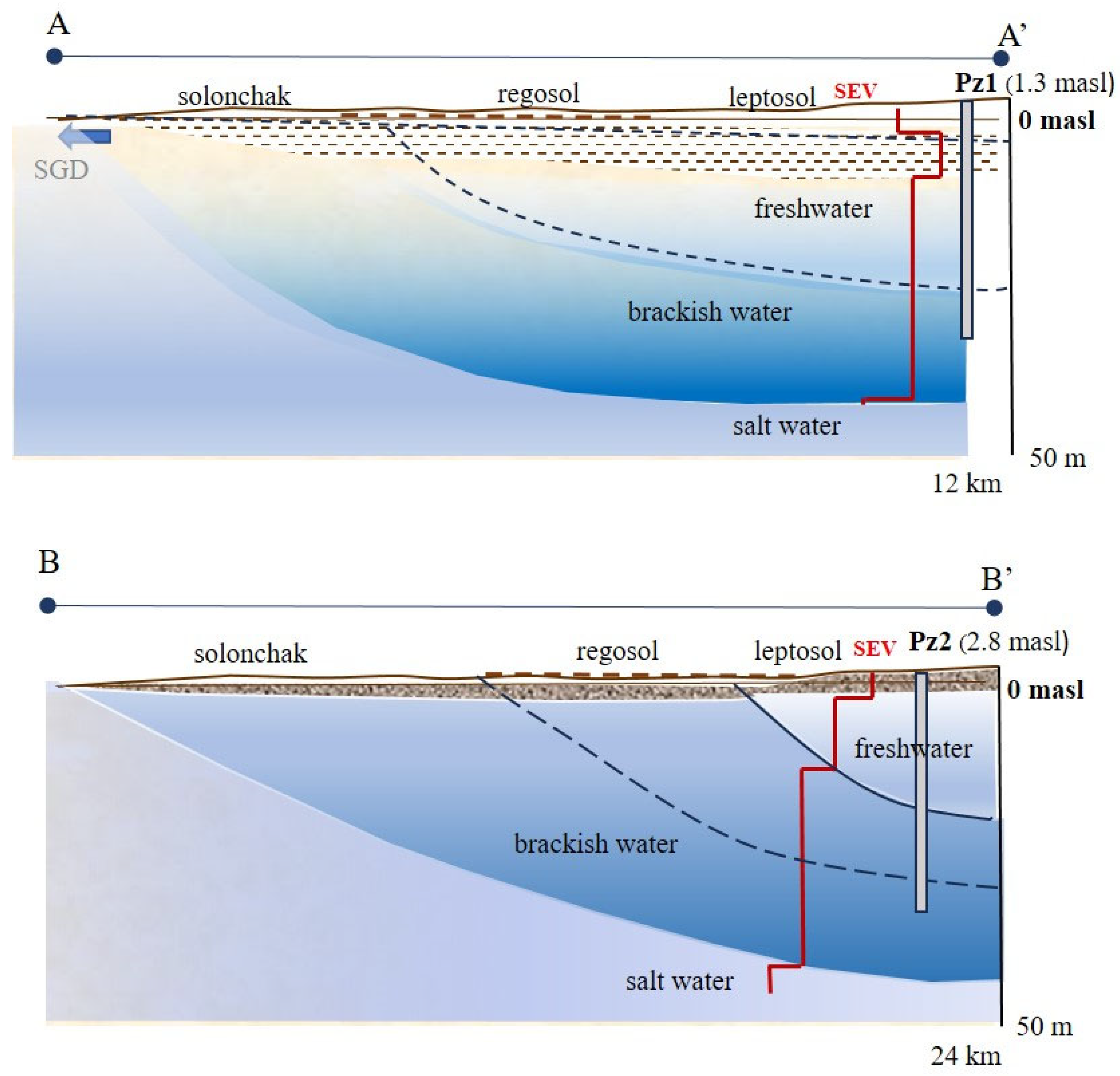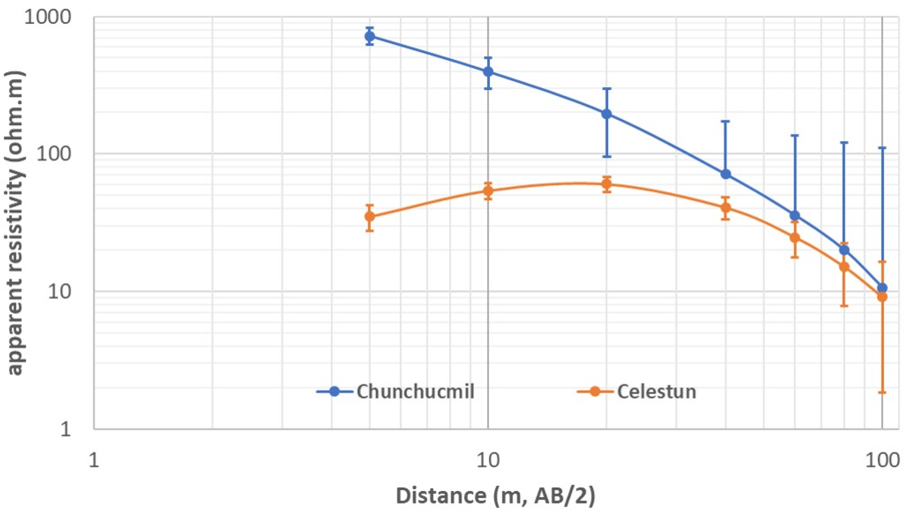 - Vertical Electrical Sounding (VES) was carried out using the SuperSting R8 system (Advanced Geosciences) with a Schlumberger array configuration (AB/2 = 100 m). Data was processed using the Ipi2Win software (free version 3.01) for both piezometers.