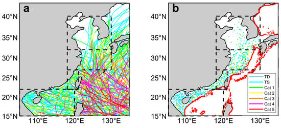 (a) Six-hourly TC tracks from 2004 to 2021. (b) TC track points in the coastal seas. The thick red solid lines indicate 200 m isobath. Different colors indicate different categories of TC intensity: TD, TS, and Cat 1–5. Black dashed boxes indicate different coastal seas: YS, ECS, TWS and NSCS.